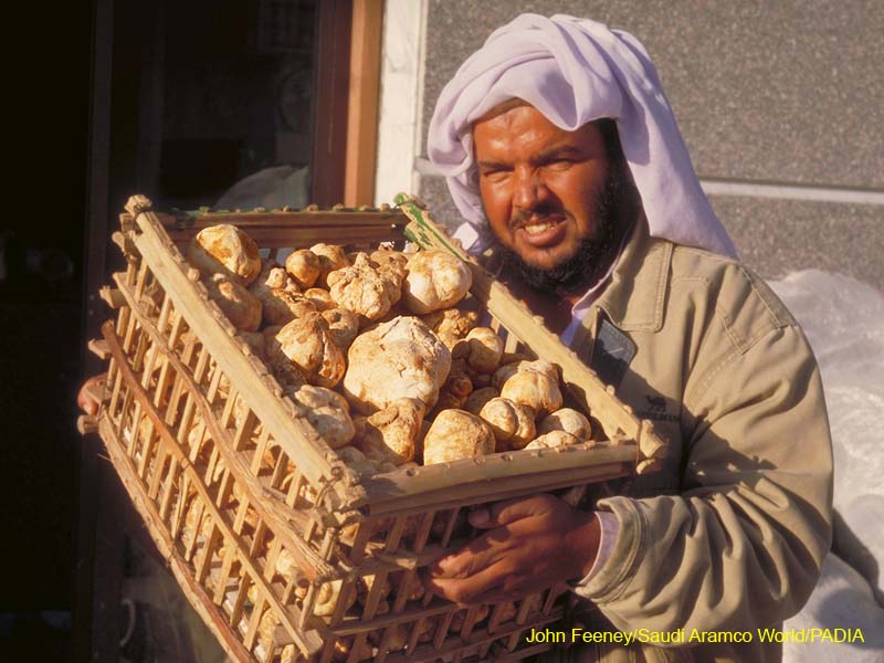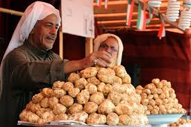 But the truffles from the desert countries will never be mistaken, in appearance at least, for those from Europe. Desert truffles are a species of the mushroom family, and are only distantly related to their more pungent, far more costly European cousins. There have been numerous varieties of desert truffles grown from North Africa to the Gulf States. Terfez is the collective name given to truffles grown in Morocco, Algeria and Tunisia, while the Bedouin of the Western Desert call them terfas. In Turkey they are called damalan or borchii and in Kuwait, fagga. English speaking countries call these desert truffles honey truffles. The three most common types are, Tirmania, Terfezia and Tuber. These have been sourced in North Africa for over 1,800 years. The latter, Tuber, grown in Morocco, is similar to the European truffle while the other two varieties, or collectively, kamah, one white (Tirmania) and one black (Terfezia) are larger, lighter in flavour, eaten as a vegetable and grown in for example, the deserts of Syria and Iraq.