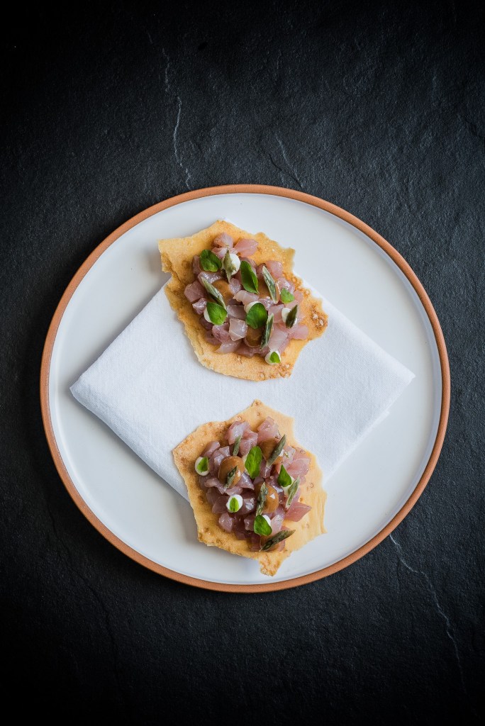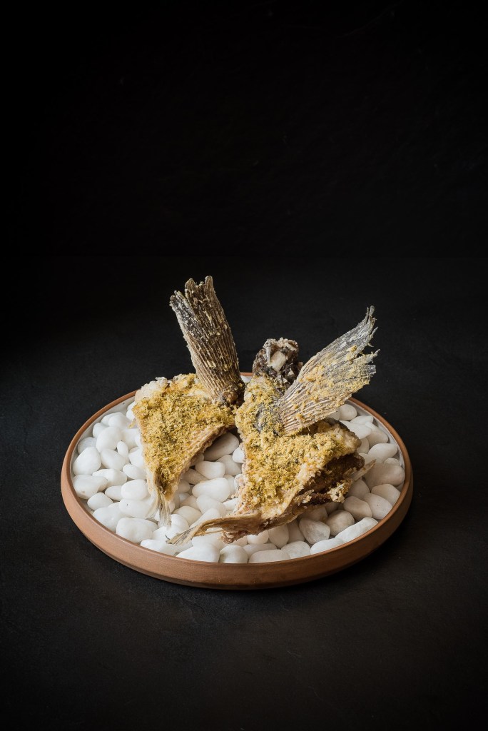 Fried fish collars, dried Tautau & Fennel seed crust, nasturtium vinegar