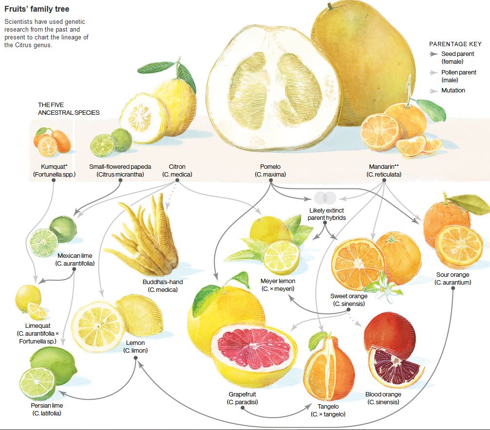 Citrus is ancient. Fossilized leaves discovered in China’s Yunnan Province in 2009 and 2011 suggest citrus has existed since the late Miocene epoch, as many as seven million years ago. Citrus taxonomy is complex, too complex for me to satisfactorily account for here. But Wikipedia, the National Geographic and Speciality Produce all have interesting accounts.