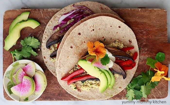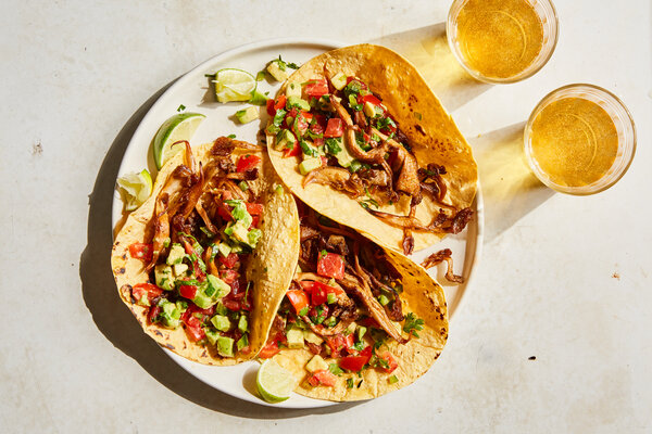 And so to this week’s recipe: Mushroom Chicharrón Tacos by Joyce Ramirez, who says ‘this recipe calls for pan-searing oyster mushrooms so they become as perfectly crispy and golden as chicharrón (pork rind). Paired with fresh pico de gallo, these mushrooms feel satisfying with their natural umami savoriness. This quick dish tastes like juicy carniceria tacos that balance the richness of fried mushroom with the acidic punch of salsa’.