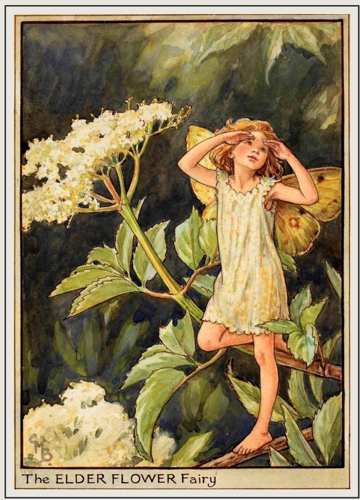But I think I will take a side step from health and research to look at the fairies and witches and and elderflower. My friend, Dianne, suggested I look at the role of the Elder tree in oral traditions, and she sent me some literature which especially focussed on those stories which include fairies. I was struck by the use of one illustrator’s work in the articles I read on the Elder tree and Fairies, witches and demons. Cicely Mary Barker (1895-1973) was an illustrator and creator of the various works of Flower Fairies. Cicely always asked her model (often her sister) to hold the flower, twig or blossom of a particular fairy, for she wanted to be sure of the accuracy of her depiction of the shape, texture and form of the plant. Her only alteration was to the size, she enlarged the flower to make it the same size as the child.