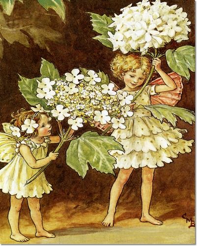 Cicely’s flowers are always botanically accurate. If she could not find a flower close at hand, she enlisted the help of staff at Kew Gardens, who would often visit with specimens for her to paint. In a foreword to one of her early editions, she wrote that she had drawn all the plants and flowers very carefully from real ones and everything was as true as she could make it, that she had, however, never seen a fairy. (source: Cicely Mary Parker, Wikipedia). In the illustrations above we see her model(s) next to an elder flower.
