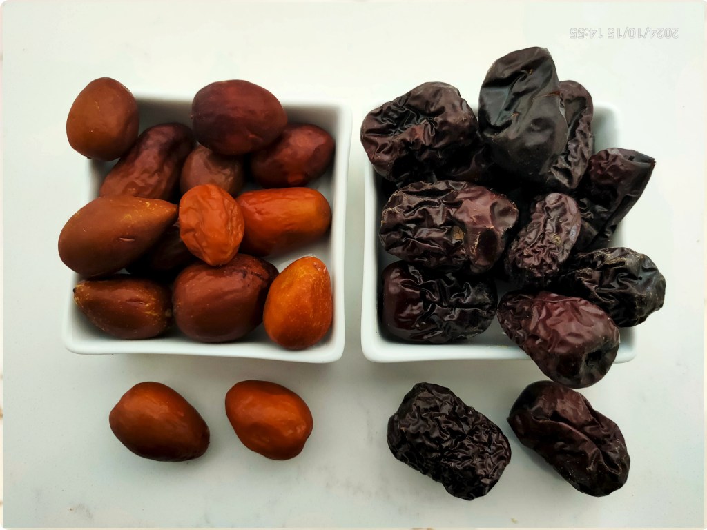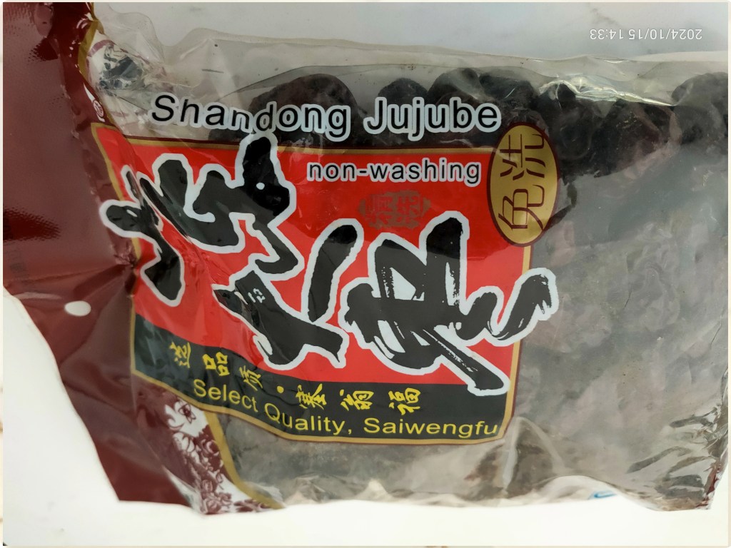 Coincidentally, I came across a packet of Shandong Jujube in my pantry which had been there for ages, perhaps even shipped from New Zealand, just gathering dust, as an ingredient does when you buy on impulse but have no idea what you can or want to do with it (I have a lot of those!). These, being dried, are much less palatable, again with a central stone, dry, papery, but promising a sweetness that could be quite intense.