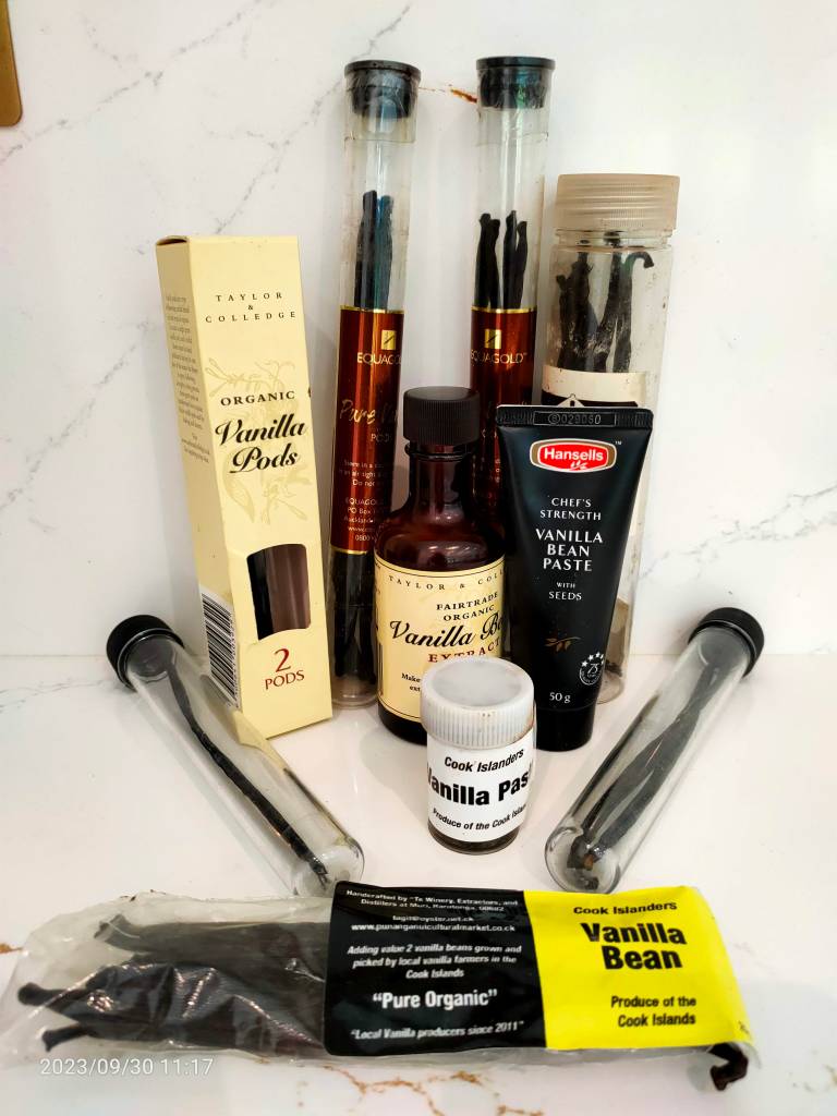 In my store cupboard I have an item, versions of which say they originate in Tahiti, Papua New Guinea, and the Cook Islands. I have no idea where others originated but most I know came with me from New Zealand and I can locate their origins firmly in the southern hemisphere. Some come in multiples from each location, and in pastes, pods and liquids. They are stored in anonymous or labelled pippetes, in bottles, in tubs, in a tube and in simple clear packaging. Most are ‘pure’ and have the longest ‘best by’ date (commonly 2035) you can imagine – I think it is notional. One paste is unadulterated and one has sugar, inulin and gum tragacanth added. You might think I have an obsession with this item, but no, I just like collecting really good versions of ingredients. Vanilla has given me plenty of opportunity for this.